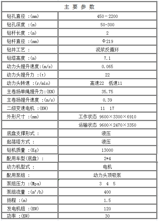 ●此機(jī)型是我公司設(shè)計(jì)制造的一種機(jī)械動(dòng)力頭帶泵鉆進(jìn)式反循環(huán)鉆機(jī)。本鉆機(jī)的特點(diǎn)是動(dòng)力頭機(jī)型,給進(jìn)行程長,加接鉆桿方便,無需加接主動(dòng)鉆桿。動(dòng)力頭帶泵頂吸反循環(huán)泥漿鉆進(jìn),有利于提高鉆進(jìn)效率,作業(yè)口徑大、效率高、能力強(qiáng)、施工成本低、技術(shù)成熟、性能可靠、操作簡單、使用和維護(hù)方便、制作成本低,特別適用于土層、砂層、卵砂層、軟巖石層的水井和基樁。動(dòng)力頭有兩種轉(zhuǎn)速,可用于不同地層的鉆進(jìn)。鉆桿結(jié)構(gòu)形式新穎,提引、擰卸工具獨(dú)特,連接、拆卸鉆桿方便、快捷。產(chǎn)品有履帶底盤、汽車底兩種裝配方式,鉆機(jī)移位、就位方便液壓起落鉆塔,操作方便,省時(shí)省力。